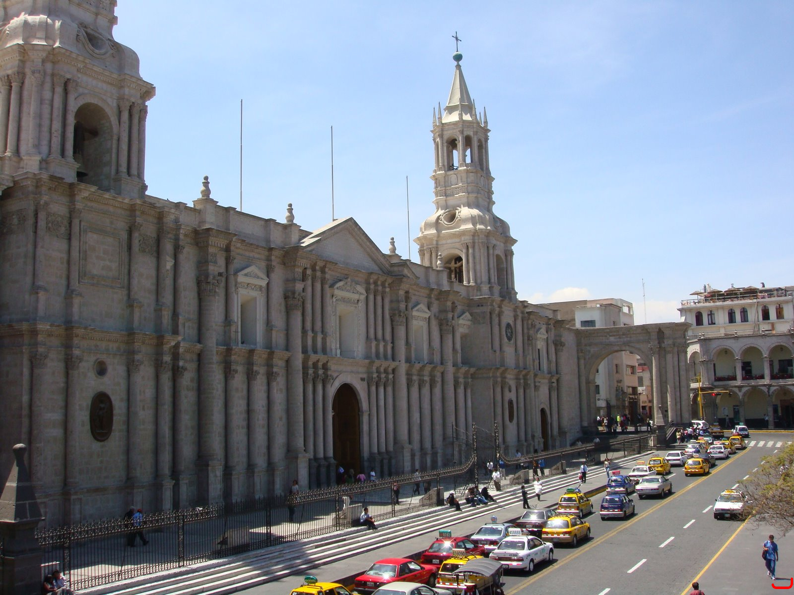 La catedral de Arequipa, la principal iglesia de la ciudad. Su construcción se inicio en el año 1540 y termino en el año 1656 cuando acabaron su estilo final, esta construida con sillar u ladrillo, la plaza de armas esta al frente de la catedral. Su antiguo nombre fue Señor San Pedro, fue destruida en el año 1844 y reconstruida por completa, también han habido muchos terremotos para lo cual después se hizo trabajos de reconstrucción, posee tesoros orfebres como la mayoría de iglesias importantes.